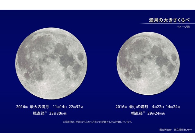 11月14日(月)の月は「スーパームーン」。天文学の正式な用語ではないため定義ははっきりしないが、通常の満月より大きく見え、今年の満月のうちで最大とされていることから注目されている。観察に適した時刻や場所はどこだろうか。◆スーパームーンとは 国立天文台によると、「スーパームーン」とは天文学の正式な用語ではなく、定義もはっきりしていない。ただし、通常の月よりも大きく見えることから観察に期待が集まっており、ネット上では「今年(2016年)最大の満月らしい」と話題だ。◆なぜ大きく見える? アストロアーツによると、月の公転軌道は楕円であるため、月と地球との距離は約36万kmから40万kmの間で変化する。そのため、最接近のタイミングと満月となるタイミングが近いと、月が大きく見える仕組み。国立天文台によると、最大の満月は最少の満月と比べ直径で14%、面積で約30%大きい。しかし、月の大きさを何か月も正確に記憶しておくことは難しく、「今日の月は大きい」とはっきり感じ取ることは困難かもしれない。 そもそも、「今日の月は小さいな」「大きいな」と感じるのは“錯覚”の一種。夕方に昇ってきたばかりの月をとても大きいと感じることはないだろうか。国立天文台は、この月や太陽が地平線(水平線)近くにあるときに大きく見える現象は「目の錯覚によるもの」としているが、なぜこのような錯覚が起こるのかについては未解明だという。◆68年ぶりの近さ!? 観察に適した時間は? とは言え、錯覚だとわかっていても大きな満月を確認したい場合はどうすればいいのか。アストロアーツは、2016年11月14日(月)の月の最接近タイミングは午後8時20分ごろとしている。月が地球に約35.7万kmまで最接近し、その約2時間半後の22時50分ごろにちょうど満月になるという。 アストロアーツが1900年からの満月を距離が近い順に並べた「満月の近さランキング」によると、2016年のスーパームーンの距離は35万6,521km。この距離は1912年1月の35万6,375km、1930年1月の35万6,405km、1948年1月の35万6,490kmの次に近く、1948年との差は約30km。「68年ぶりの近さ」「68年ぶりの大きさ」と称されているのは、この1948年と比較してのことである。 国立天文台はこの「68年ぶり」との意味が一人歩きしている現状にコメント。月を地平線近くで見るか、天頂近くで見るかによって観察者から月までの距離は約6,400km違うことは話題にならず、約30kmの「小さな差」が取り上げられるのは「やや不思議な感じがしませんか」と疑問を呈している。そもそも、満月の近さランキングを見ると、1972年11月は35万6,524km、1993年3月は35万6,530kmと、近年でも今年同様の近さが観測されている。 スーパームーン、ブルームーン、ピンクムーン…月の呼び方はさまざまだが、呼び名だけではなく、天体現象をきっかけとした宇宙の秘密も学んでみてはいかがだろうか。