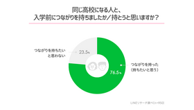 LINEリサーチが春から高校生になる男女を対象に行った調査によると、「同じ高校になる人と、入学前につながりを持った・持ちたい」とする回答が76.5%となり、入学前から友だちづくりを意識する傾向にあることが明らかになった。 調査は2020年3月12日~13日、2020年4月に高校入学予定の男女を対象に、「高校生活が始まる前にやっておきたいこと」について実施し、1,052サンプルの有効回答を得た。 「同じ高校になる人と、入学前につながりを持ったか(持とうと思うか)」との質問に、新高校生の76.5%が「つながりを持った(持ちたいと思う)」と回答した。 「どんな方法でつながったか(つながるか)」の質問に、「特に何もしていない」とする男子は26.6%である一方、女子は19.0%となり、女子のほうが入学前につながるために行動している(するつもりである)割合が7.6ポイント多かった。 行動内容では、男子では「入学先が一緒である同じ中学の子を探す」との回答が22.2%ともっとも多く、ついで「入試のときに直接話をして連絡先を交換する」21.6%、「Instagram」19.0%、「LINE」18.1%だった。 女子は「Instagram」37.9%がもっとも多く、「同じ中学の子を探す」29.4%、「Twitter」18.7%、「入試のとき」16.9%と続き、「LINE」も16.4%が回答した。新高校生は入学前から「Instagram」「Twitter」「LINE」などを活用して同じ高校の人を見つけているようすが見られ、女子は男子に比べてSNSでつながりを持とうとする子が多い傾向にあった。