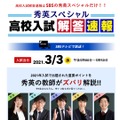 SBSテレビは2021年3月3日の午後5時より、同日に実施される静岡県公立高等学校入試の問題を解説する特別番組「秀英スペシャル 高校入試解答速報」を放送する。番組終了後は、Webサイトに問題と解答、解説動画を掲載する。 2021年度静岡県公立高校一般選抜は、3月3日と4日に学力検査・面接などを実施。3月12日正午以降に合格発表を行う。 SBSテレビは入試当日となる3月3日午後5時から午後5時50分まで、特別番組「秀英スペシャル 高校入試解答速報」を放送。秀英予備校の講師陣が、2021年入試で出題された重要ポイントを解説する。中学3年生だけでなく、中学1・2年生にも見てほしい内容だという。番組終了後には、Webサイトに問題と解答、解説動画を掲載する予定。 静岡県公立高等学校入試における一般選抜は、全日制の募集定員1万9,015人に対し、志願者数は1万8,868人で、志願倍率は0.99倍だった。各学校の志願倍率は、静岡(普通)1.28倍、磐田南(普通)1.07倍、磐田南(理数)1.40倍、浜松北(普通)1.37倍、韮山(普通)1.15倍、韮山(理数)1.23倍、沼津東(普通)0.88倍、富士(普通)1.04倍、富士(理数)1.18倍など。◆秀英スペシャル 高校入試解答速報放送日時:2021年3月3日(水)17:00~17:50放送局:SBSテレビ(6ch)解説:秀英予備校講師陣