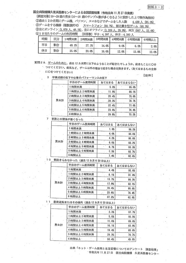 次に県議会は、子供のゲームやネットの利用制限時間を定める際に参考にした資料として「スマートフォン等の利用時間と平均正解率の状況」と「国立病院機構久里浜医療センターによる全国調査結果」を提示しました。