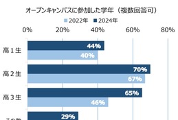 続いての「興味を持ったすべての学校のオープンキャンパスや学校説明会に参加したか」という問いには、進路選択への満足度に関わらず半数以上が「いいえ」と回答。進路選択に後悔している人は「オープンキャンパスに参加する必要性を感じなかった(直接大学や専門学校を訪れるのが面倒だった)」が36.7%ともっとも多く、次に「遠方のため参加が難しかった」が22.4%で続いた。一方で進路選択に満足している人では「(中略)必要性を感じなかった」と回答した人よりも「遠方のため参加が難しかった」(28.9%)、「日程の都合が合わなかった」(28.4%)という人が多くなっている。
