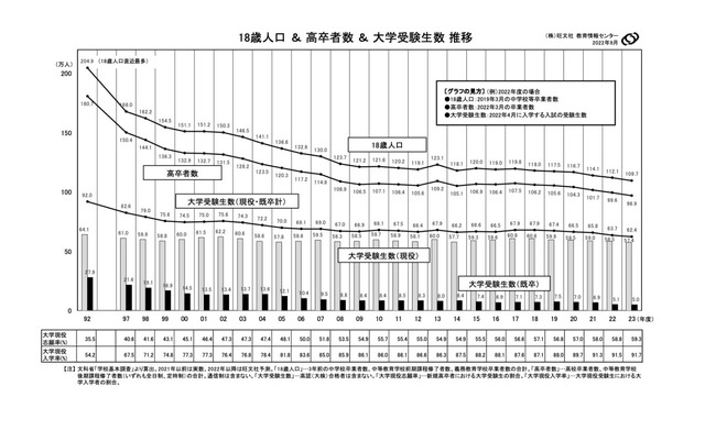 旺文社教育情報センターは、学校基本調査や入試結果をもとに、今後の受験生数予測を発表。18歳人口の減少や大学現役志願率の動向、既卒生の減少等を踏まえ、2023年入試の受験生数は前年比2.0%減の62.4万人と予測。大学現役志願率は前年比0.5ポイント増の59.3%、大学現役入学率は前年比0.2ポイント増の91.7%と予測している。