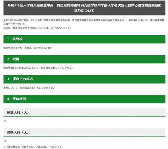 東京都立中高一貫型聴覚障害特別支援学校中学部の後期入学者決定(一般募集)において、適性検査問題に誤りがあったことが明らかになった。該当する学校は杉並区にある都立中央ろう学校で、問題の誤りに対して、東京都教育庁は2025年2月3日、全員を正答扱いとして採点する対応を取ることを発表した。