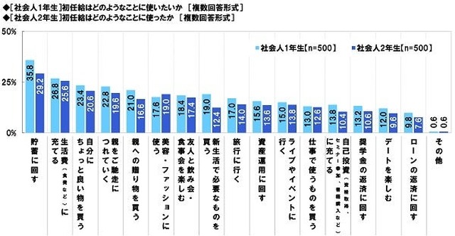 初任給の使いみちについては、社会人1年生の35.8%が「貯蓄に回す」と回答し、もっとも多かった。ついで「生活費(食費など)に充てる」(26.8%)、「自分にちょっと良い物を買う」(23.4%)が続いた。なお、社会人1年生と2年生の回答を比較すると、「貯蓄に回す」(社会人1年生35.8%、社会人2年生29.2%)、「新生活で必要なものを買う」(社会人1年生19.0%、社会人2年生12.4%)では、社会人2年生が経験した実際の使いみちより社会人1年生が考える希望の使いみちのほうが5ポイント以上高くなった。