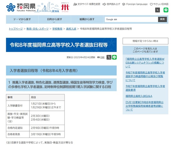 福岡県教育委員会は2025年4月24日、2026年度(令和8年度)福岡県立高等学校入学者選抜日程を公表した。推薦入学者選抜の面接・作文・実技試験・学力検査などは2026年2月3日と4日、一般入学者選抜の学力検査は3月10日に実施する。