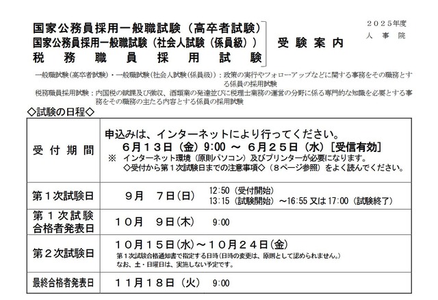 人事院は2025年5月7日、国家公務員採用一般職試験(高卒者試験および社会人試験・係員級)と税務職員採用試験の受験案内を公表した。受験申込みは6月13日から6月25日まで受け付ける。第1次試験日は9月7日。