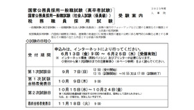 試験の申込受付期間は、6月13日午前9時から6月25日(当日受信有効)。第1次試験が9月7日、第1次試験合格者発表が10月9日午前9時、第2次試験が10月15日から10月24日の指定された日、最終合格者発表が11月18日午前9時。