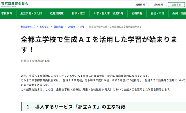 東京都教育委員会は2025年5月12日、全都立学校256校で生成AIサービス「都立AI」を活用した学習を開始すると発表した。対象となる児童・生徒は約14万人。生成AIを活用した授業や探究学習のほか、事務文書作成など校務でも活用する。