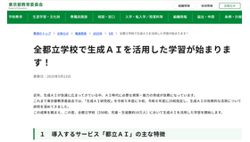 東京都では「生成AI研究校」での成果を踏まえて、教員向け指導資料として「都立学校生成AI利活用ガイドラインVer.1.0」「生成AI研究校初回授業モデル指導案」「生成AIについて学ぼう!」を作成し、ポータルサイト「とうきょうの情報教育」で公開。教職員と児童・生徒が、安全かつ効果的に活用するため、環境整備を進めている。