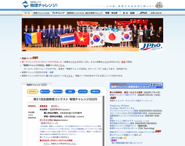 APhOやIPhOへの生徒派遣など行う物理オリンピック日本委員会は、物理の持つ面白さと楽しさを体験してもらうことを目的とした全国規模のコンテスト「物理チャレンジ」を毎年開催している。APhOとIPhOに出場する日本代表選考を兼ねており、現在、2025年度「物理チャレンジ」の参加者を募集している。個人の申込みは5月30日午後1時、学校一括の申込みは5月23日午後1時が締切。詳細は委員会Webに掲載されている募集要項などで確認できる。
