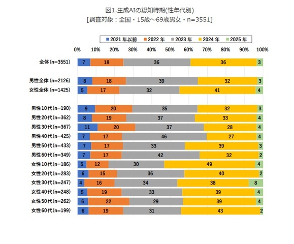 「生成AIの認知時期」については、ChatGPTがリリースされた翌年の2023年と2024年がそれぞれ36%でもっとも高かった。性別で比較すると、男性の方が女性よりも1年早く生成AIを知る傾向があり、認知のピークは2023年だった。男性は2021年以前から2023年にかけて生成AIを知った割合が高いことがわかった。