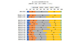 職業別の認知度の時期は、多くの職業で生成AIを知った時期のピークは2023年だが、「パート・アルバイト」「高校生」「専業主婦・主夫」は、1年遅い2024年がピークとなった。