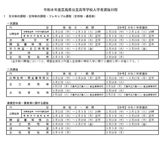 このうち、2026年度広島県立高等学校入学者選抜の日程は、一次選抜が2026年1月22日から2月3日午後4時まで志願者登録、2月12日から18日正午まで志願変更、2月12日から19日正午まで調査書等提出を受け付ける。学力検査や自己表現などは2月25日から27日、追検査は3月4日に実施。合格発表は3月9日。
