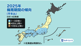 ウェザーニューズは2025年5月14日、2025年の「梅雨入り・梅雨明け見解」を発表した。沖縄・奄美の梅雨入りは平年より遅く、九州南部から東北北部は概ね平年並みとなる予想。梅雨明けは沖縄から近畿、東北南部・北部で平年より早く、東海・関東甲信・北陸では平年並みとなる見込み。梅雨の期間は短く、特に沖縄・奄美では10日以上短くなるとみられている。