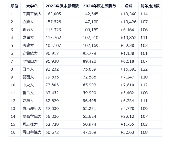 駿台予備学校が発表した2025年度入試状況分析によると、2025年度の私立大学入試は、全国的に志願者数が増加傾向にあり、特に志願者数が5万人を超える私立大学が16大学となった。千葉工業大、近畿大、明治大、東洋大、法政大の5大学が10万人を超え、前年度と同数を維持した。