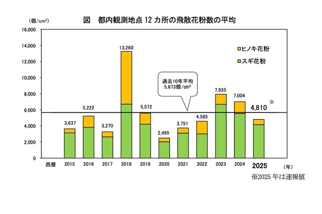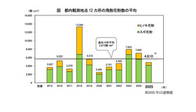 東京都は毎年、花粉飛散予測や飛散花粉数の観測を行っている。今回、2025年春の花粉飛散数についての観測結果を速報として公表した。2025年1月6日から5月14日までの期間、都内12地点の飛散花粉数の平均は、平方センチメートルあたり4,810個。2024年春の7割で、過去10年(2015年~2024年)平均の8割だった。花粉別では、2024年春に対してスギは7割、ヒノキは5割。過去10年平均と比べると、スギは平均並み、ヒノキは4割であった。
