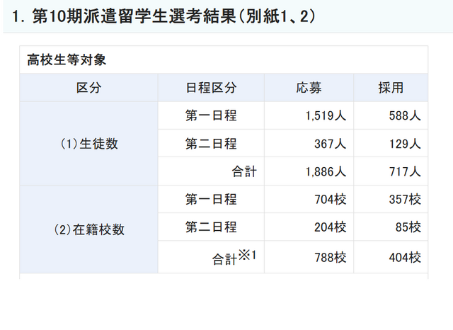 2025年度第10期「新・日本代表プログラム」高校生等対象の第1日程は2024年12月2日~2025年1月23日に募集し、1,519人の応募者の中から、588人を採用。第2日程は4月1日~21日まで募集し、応募者367人のうち、129人が派遣留学生として採用された。両日程の採用者数は全国404校717人。留学先は欧州や北米、アジアなど、世界55か国・地域に及ぶ。