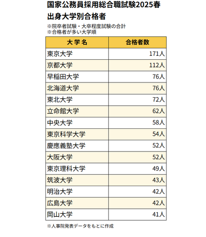 人事院は2025年5月30日、2025年度国家公務員採用総合職試験(春)の合格状況を発表した。合格者数トップは「東京大学」で171人、ついで「京都大学」112人、合格者の64.9%を国立大出身者が占めた。