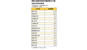 出身大学別の合格者数は「東京大学」171人がもっとも多く、「京都大学」112人、「早稲田大学」76人、「北海道大学」76人、「東北大学」72人、「立命館大学」62人、「中央大学」58人、「東京科学大学」54人、「慶應義塾大学」52人、「大阪大学」52人と続いた。10人以上の合格者を出した大学は計42校だった。