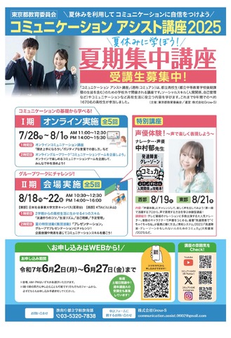 東京都教育委員会は2025年6月2日、2025年度(令和7年度)「コミュニケーションアシスト講座」の7月募集を開始した。対人関係やコミュニケーション、「読み・書き・計算」など特定分野の勉強が苦手など、悩みや困り事を抱えている都立高校生が対象。今回は、通年長期講座(講座A)の再募集と、夏休みに行う短期集中講座(講座C・第I期および第II期)の参加者を募集する。受講料・教材費無料。