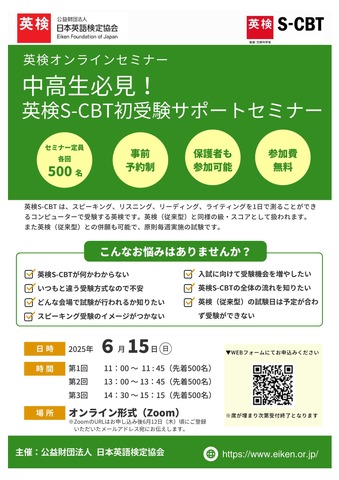 日本英語検定協会は2025年6月15日、「中高生必見!英検S-CBT初受験サポートセミナー」をオンラインで開催する。英検S-CBT受験のメリットや試験会場のようすなどを解説する。対象は3級~準1級の合格を目指している人、保護者、先生など。参加費無料、先着。