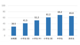 一方、睡眠時間は年齢が上がるにつれてが減少し、幼稚園児では74.7%が9時間以上の睡眠を確保しているのに対し、高校生では6~7時間が最多となった。小学低学年までは午後9時台の就寝が主流だが、中学生では午後10時台、高校生では午後11時台が最多となり、年齢とともに就寝時刻が後退していることがわかった。