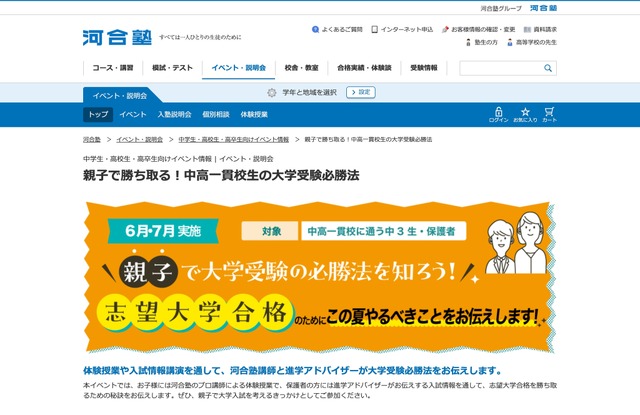 河合塾は2025年の6月から7月にかけて、中高一貫校に通う中学3年生とその保護者を対象としたイベント「親子で勝ち取る!中高一貫校生の大学受験必勝法」を、全国16校舎にて開催する。体験授業や入試情報講演を通して、志望大学合格のためにこの夏やるべきことを伝える。参加無料、河合塾Webサイトから申し込む。