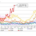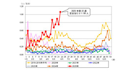 東京都では、定点医療機関からの患者報告数が都全体で基準値1.0人を超えた場合、または注意報レベルにある保健所の管内人口が東京都全体人口の30%を超えた場合に注意報を発令している。直近では、第17週(4月21日~27日)にも注意報基準を超えたが、その後、注意報基準を下回り、今回再度、注意報基準を超えた。
