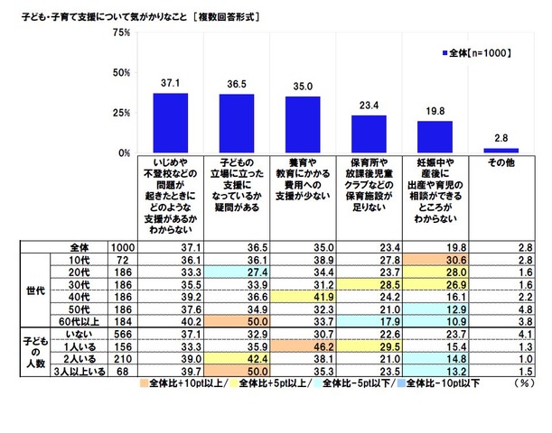 調査結果によると、子供が1人いる家庭では「養育や教育にかかる費用への支援が少ない」との声が多く、子供が2人以上いる家庭では「子供の立場に立った支援になっているか疑問がある」との意見が目立った。これからの子供・子育て支援については、「養育や教育のための経済的支援の強化」が必要だと考える人が多く、子供が1人いる家庭では「子供や保護者のさまざまな悩みに対応するワンストップの相談機関」が求められている。