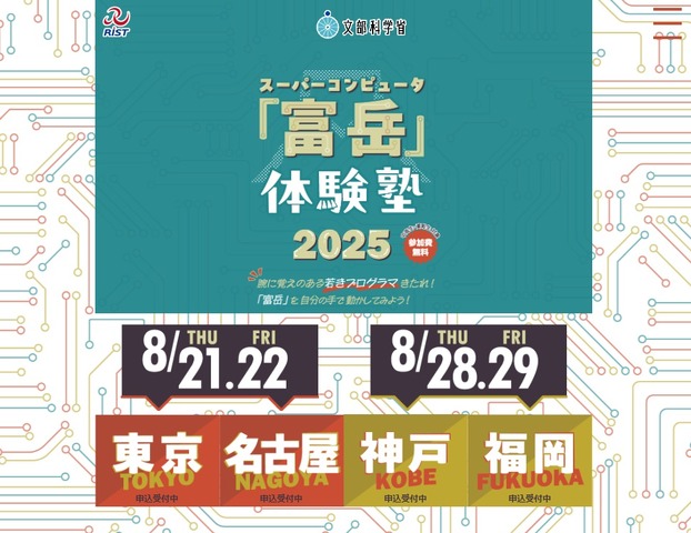 高度情報科学技術研究機構(RIST)は、「スパコン『富岳』体験塾2025」を2025年8月21・22日に東京・名古屋、28・29日に神戸・福岡で開催する。対象は中学生・高校生・高専生でC言語の基本を理解していることが参加条件。参加費無料、先着。申込みはWebサイトより7月11日まで。