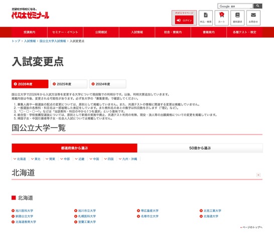 国公立大学の入試変更点は、2026年度から入試方法などを変更する大学について現段階での判明分を掲載したもの。都道府県または50音順で大学を選択すると、2025年度と比較した変更点が確認できる。原則として、募集人員や一般選抜の配点の変更については掲載していない。また、共通テストの「情報」に関連する変更も掲載していない。