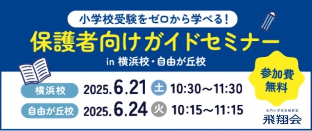 城南進学研究社が運営する、名門小学校受験専門の幼児教室「飛翔会」は、小学校受験を初めて検討する保護者を対象にした無料セミナー「ゼロからはじめる小学校受験セミナー」を開催する。2025年6月21日に横浜校、6月24日に自由が丘校で実施。申込みは公式サイトにて受け付ける。