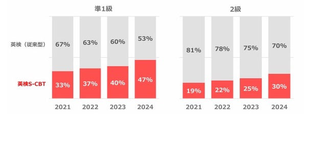今回、2021年度から2024年度までの4年間で、級別に「英検(従来型)」「英検S-CBT」の志願者数の割合を分析した。準1級の英検S-CBT志願者は、33%から47%に増加。2級においても増加しており、30%に達したという。