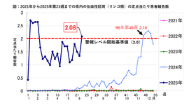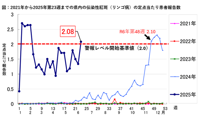 国立健康危機管理研究機構(JIHS)によると、2025年は過去5年間の同時期の平均と比較して、全国的に伝染性紅斑(リンゴ病)の感染者数がかなり多いという。第22週(5月26日~6月1日)の定点あたり報告数(JIHSの速報値)を都道府県別でみると、山形県(5.81人)、栃木県(5.63人)、北海道(5.12人)、群馬県(4.52人)、石川県(4.21人)の順に多かった。千葉県は第22週時点では1.34人だったが、第23週に2.08人へと急増したとみられる。