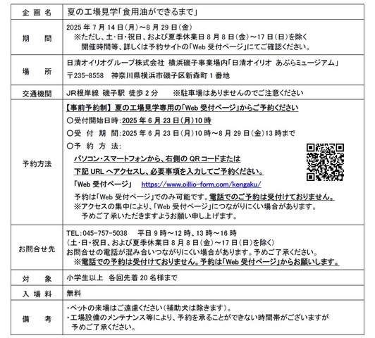 見学期間は2025年7月14日から8月29日までで、土日祝日と夏季休業日8月8日~17日を除く平日に実施される。見学場所は横浜市磯子区にある「日清オイリオ あぶらミュージアム」で、JR根岸線磯子駅から徒歩2分の場所に位置する。駐車場は用意されていない。