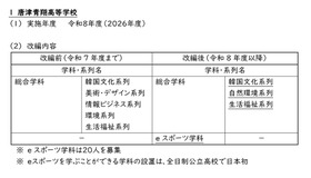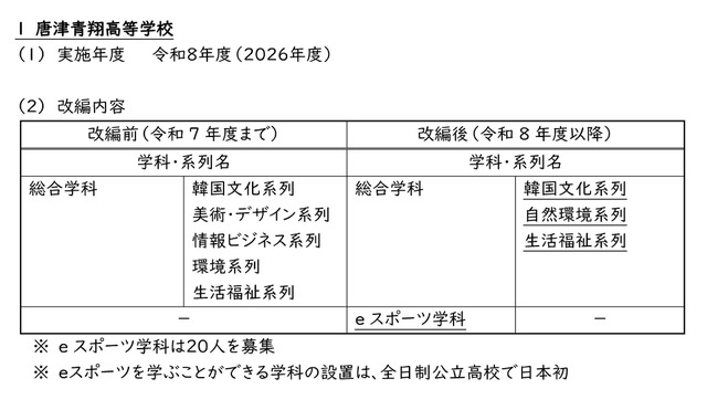 佐賀県教育委員会は2025年6月9日、2026年度(令和8年度)県立高校の学科等改編について公表した。唐津青翔高校は「eスポーツ学科」を新設、総合学科の5系列を3系列へと再編、神埼高校は普通科に「普通科こども教育進学コース」を新設する。