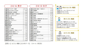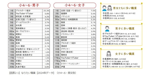 なりたい職業について男女別でみると、小学校4~6年生の男子は「プロスポーツ選手」(25.3%)、女子では「店員(花屋・パン屋など)」(7.5%)がもっとも多いことがわかった。男子は、2位に「YouTuber・VTuber」(5.8%)、3位「研究者・大学教員」(4.2%)、女子は2位「看護師」(5.4%)、3位「パティシエ」「保育士・幼稚園教員」(5.3%)と続く。