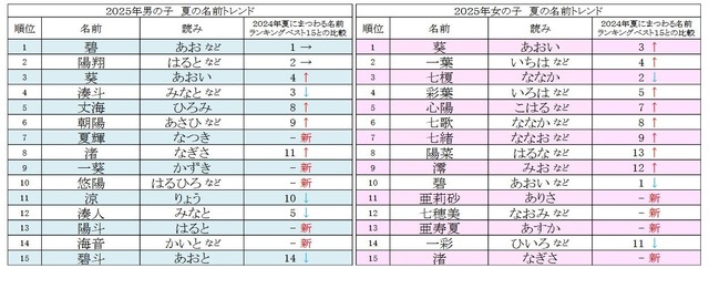 リクスタは2025年6月11日、月間400万アクセスを誇る「無料 赤ちゃん名づけ」のWebサイトおよびアプリから「2025年男女別 夏にまつわる名前ランキングベスト15」を発表した。男の子の第1位は「碧(あお)」、女の子の第1位は「葵(あおい)」が選ばれた。