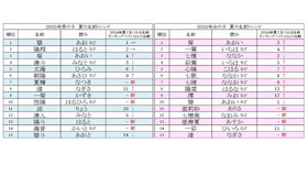 新規でランクインした名前は、男の子が5件(約33%)、女の子が4件(約27%)だった。男の子第7位「夏輝(なつき)」、女の子第13位「亜寿夏(あすか)」といった、テーマである「夏」の字を使用した名前が男女1件ずつ入った。また、新規でベスト15に入った9件のうち5件がカムバックランクイン、残りの4件は今回初めてのランクインだった。