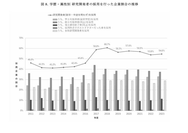 文部科学省科学技術・学術政策研究所は2025年6月25日、「民間企業の研究活動に関する調査報告2024」を公表した。新卒・中途を問わず、研究開発者を採用した企業の割合は前年度より若干増加して54.6%、博士課程修了者を採用した割合は2年連続で増加して11.4%となった。