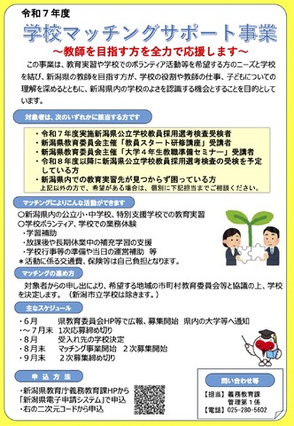 学校マッチングサポート事業は、新潟県の教員を目指す人を全力でサポートする取組みの一環として、県教育委員会が実施している事業。教育実習や学校でのボランティア活動などを希望する人のニーズと学校とをマッチングし、新潟県の教員を志望する人が、学校の役割や教師の仕事、子供についての理解を深めるとともに、新潟県内の学校のよさを認識する機会となることを目的としている。