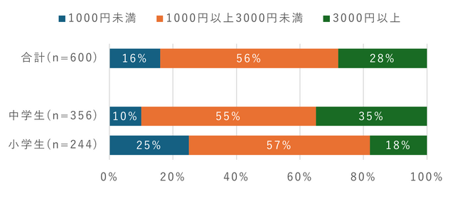 関東1都6県における2019年からの経年変化をみると、中学生のスマホ利用料金は2019年には「3,000円以上」がもっとも多かったが、2021年以降は「1,000円~3,000円」が主流となり、2024年には約6割になった。小学生も、2021年は「1,000円~3,000円」が5割弱ともっとも多く、2024年にはその割合が5割強とさらに増加した。
