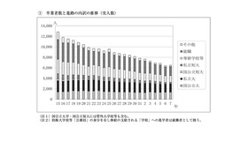 設置者別でみると、国公立・管外大への進学者は前年度比4人増の1,339人。私立大は前年度比21人増の1,568人、短大は前年度比17人減の319人。