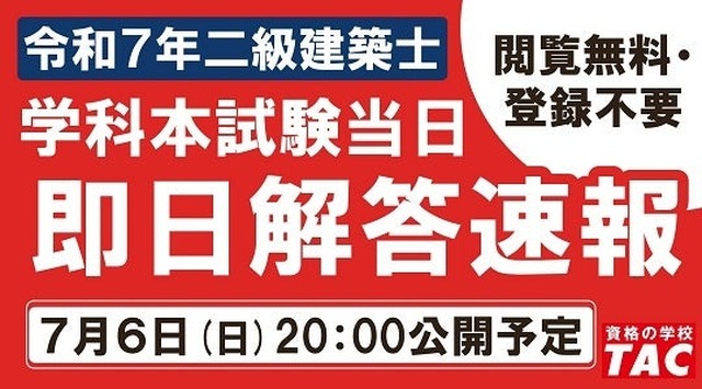 資格の学校TACは、2025年7月6日に実施される「令和7年 二級建築士学科試験」の解答速報を、同日午後8時よりTAC公式Webサイト上で公開する。さらに、試験翌日午後2時には「合格推定点」と専門講師による「講評」も公開予定。