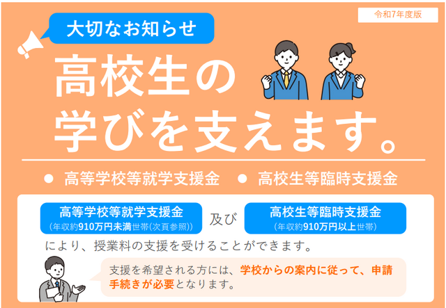 国公立高校の授業料:国公立高校の授業料は全額支援され、実質無償化される。