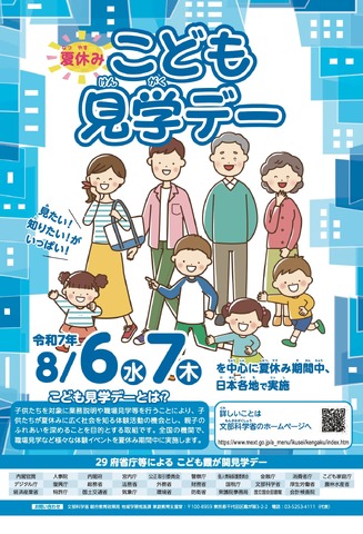 2025年8月6日と7日の2日間、霞が関の各府省庁が連携して幼児や小中学生向けに省庁見学や体験活動を行う「こども霞が関見学デー」が、文部科学省など30府省庁等にて開催される。各府省庁が工夫を凝らしたさまざまなプログラムを企画している。