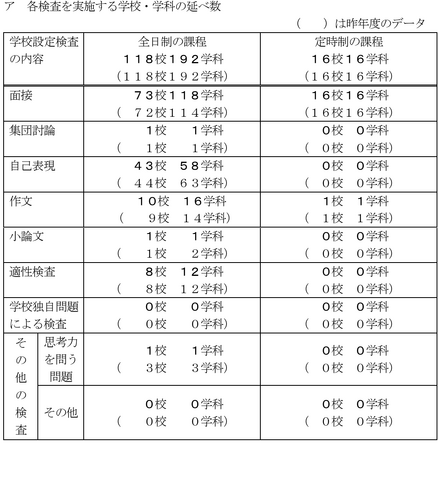 学校設定検査のうち、もっとも多いのは面接で、全日制73校118学科・定時制16校16学科が実施。このほか、自己表現は全日制43校58学科、作文は全日制10校16学科・定時制1校1学科、適性検査は全日制8校12学科が実施。集団討論は八千代(普通)、小論文は千葉東(普通)、思考力を問う問題は東葛飾(普通)のみ実施する。学校独自問題による検査実施校はなかった。