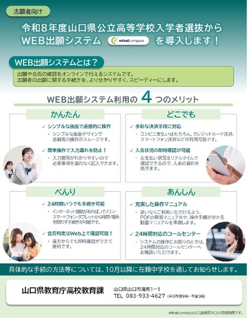 山口県は、2026年度公立高等学校入学者選抜より、Web出願システム(ミライコンパス)を導入する。Web出願システムを利用することで「かんたん」「どこでも」「べんり」「あんしん」の4つのメリットがあるという。