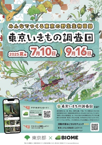 参加方法は、「Biome(バイオーム)」アプリをインストール後、「東京いきもの調査団2025夏編」に参加。クエスト対象の生物や植物を撮影してアプリに投稿する。一定の条件をクリアすると、東京の野生生物にちなんだ景品に応募ができる。景品は抽選制。