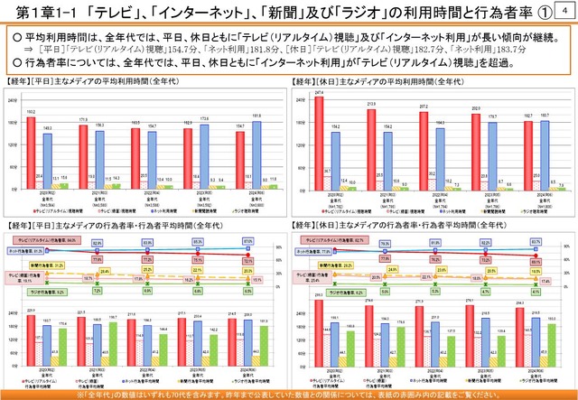 おもなメディアの平均利用時間は、平日・休日とも「インターネット」がもっとも長く、ついで「テレビ(リアルタイム)視聴」という傾向が続いていることが2025年6月27日、総務省情報通信政策研究所が公表した「2024年度(令和6年度)情報通信メディアの利用時間と情報行動に関する調査報告書」からわかった。